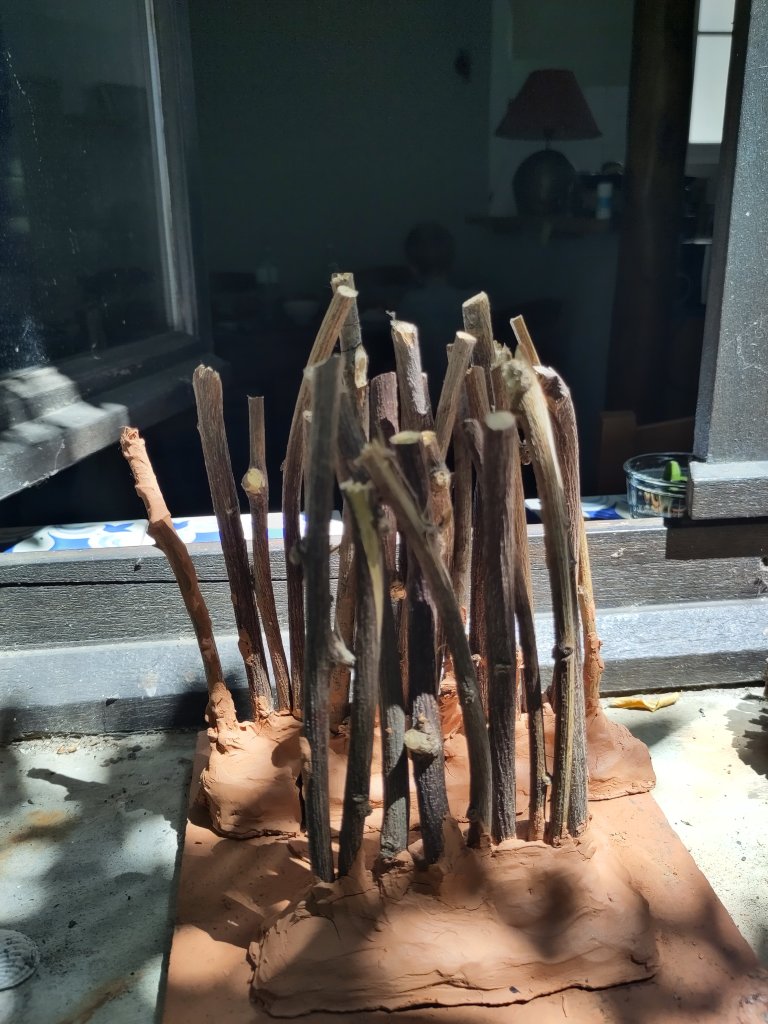 I live not alone. My family is around me. It’s hard to have hours on my own. On the table is the pot with the cutted plants and you see the rest of clay. My little son, a schoolboy, had the idea to construct palisades for his Romain Playmobil figures. So we did this together.